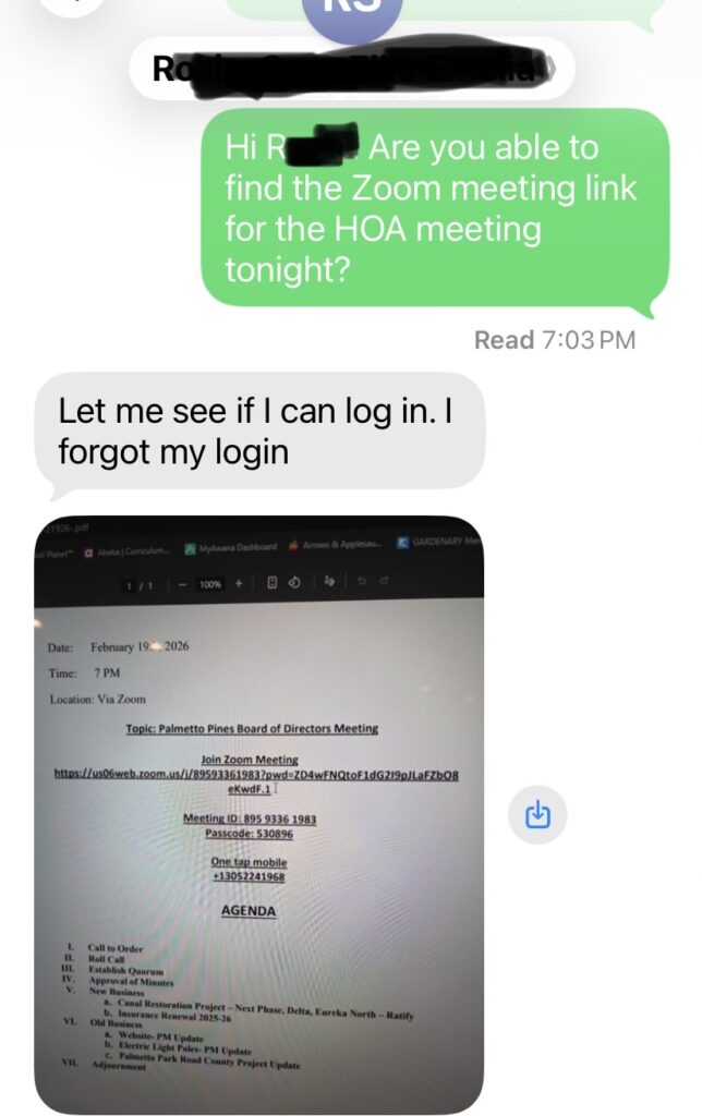 Who is going to type in that meeting address and password? I think my one neighbor who I reached out to probably copied and pasted it to be 1/2 residents who logged in with a total of 7 people in the meeting. Now, that may make for a quick and efficient meeting, but it doesn’t encourage much community involvement, responsibility, or accountability.